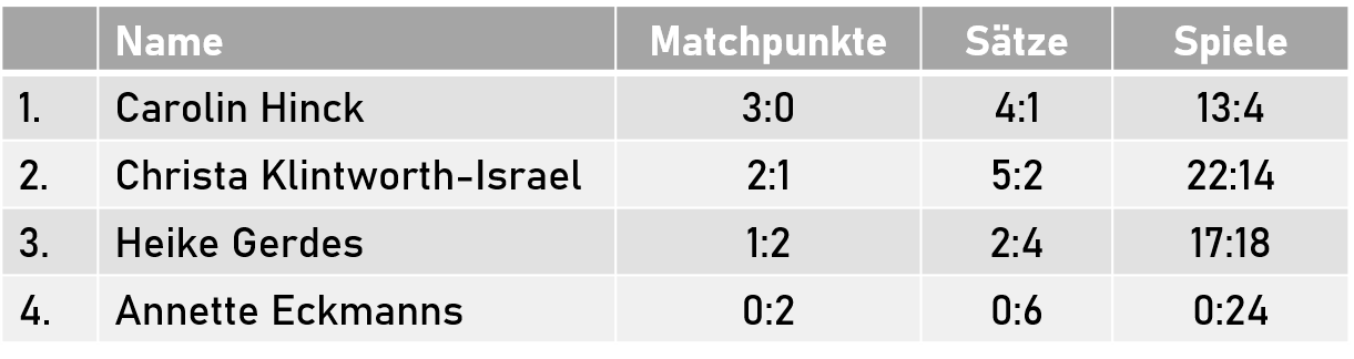 Am letzten Gruppenspieltag musste Annette erneut aufgrund ihrer VErletzung zurückziehen, so dass die Partie für Christa gewertet wurde. Im abschließenden Einzel konnte sich Carolin klar mit 4:1 4:1 gegen Heike durchsetzen und sicherte sich somit Platz 1 in der Gruppe. Auf Platz 2 landete nach der Gruppenphase Christa, Platz 3 belegte Heike und Platz 4 Annette.